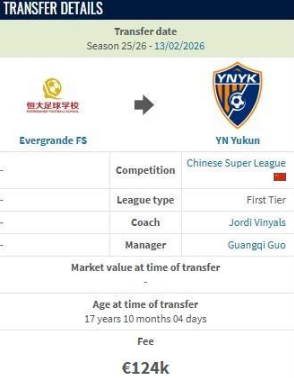 德转显示,云南玉昆约100万人民币从恒大足校签下布尼亚明。