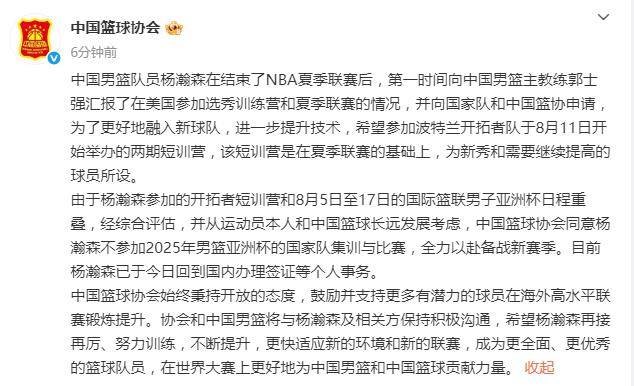 由于杨瀚森参加的开拓者短训营和8月5日至17日的国际篮联男子亚洲杯日程重叠,经综合评估,并从运动员本人和中国篮球长远发展考虑,中国篮球协会同意杨瀚森不参加2025年男篮亚洲杯的国家队集训与比赛,全力以赴备战新赛季。目前杨瀚森已于今日回到国内办理签证等个人事务。