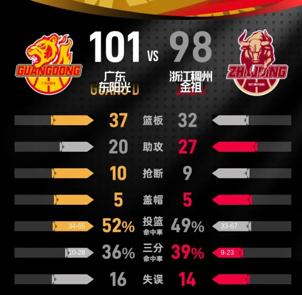 第四节,比赛进入白热化阶段,双方在攻防两端都不肯放松,比分交替上升。尽管浙江稠州金租拼尽全力追赶,广东东阳光则继续保持自己的领先优势。经过激烈的角逐,广东东阳光以101-98成功赢得比赛。