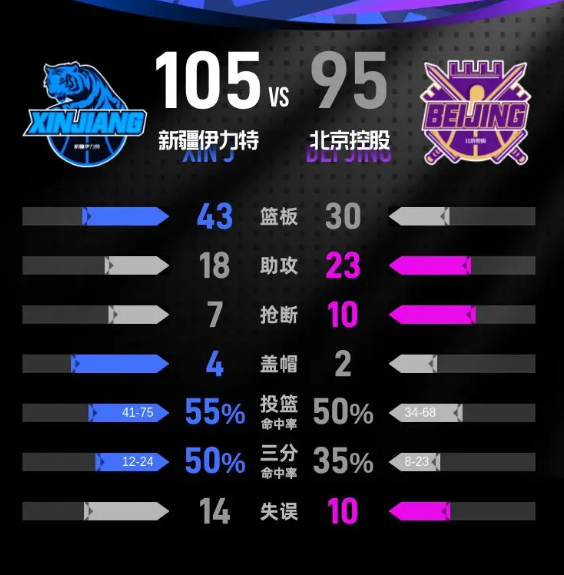 第四节,比赛进入白热化阶段,北京控股与新疆伊力特展开激烈争夺。新疆伊力特的阿不都沙拉木·阿不都热西提在本节中表现出色,贡献了12分,助力球队继续维持优势。最终,经过四节的较量,新疆伊力特以105-95锁定胜局,成功赢得了比赛。