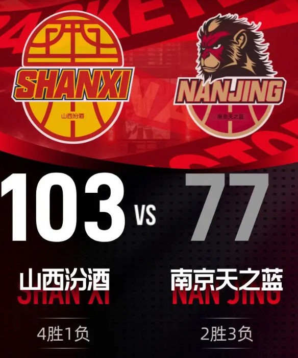北京时间12月23日CBA常规赛第5轮,客场作战的山西汾酒以103-77击败南京天之蓝,山西汾酒取得4连胜。杰伦·诺威尔20分6篮板4助攻,郭昊文23分5篮板4助攻。