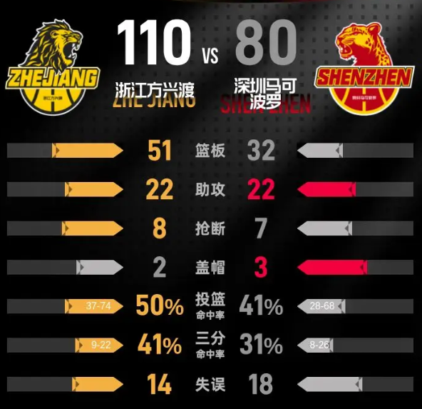 第四节伊始,浙江方兴渡再次发力,通过一波进攻将领先优势扩大至31分。深圳马可波罗在节中发起反击,将分差缩小至22分。然而,随着比赛的深入,浙江方兴渡稳扎稳打,继续扩大领先优势。值得一提的是,本节中,深圳马可波罗的特奎维恩·史密斯在三分线外表现出色,独得12分。最终,浙江方兴渡以110-80赢得比赛。