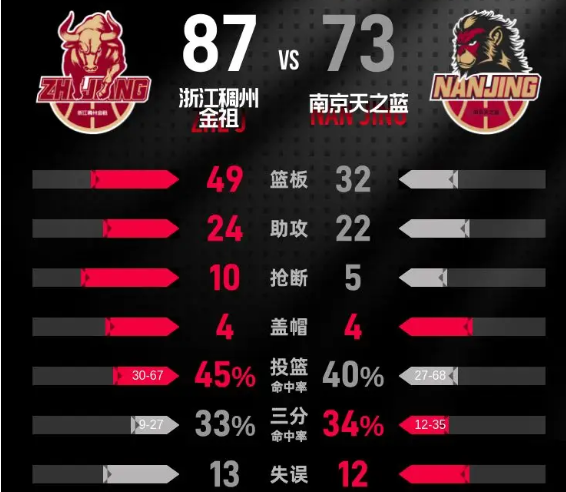 北京时间12月30日CBA常规赛第8轮,主场作战的浙江稠州金租以87-73击败南京天之蓝。盖比埃尔·约克20分7篮板7助攻,布雷迪·马内克12分10篮板2助攻。