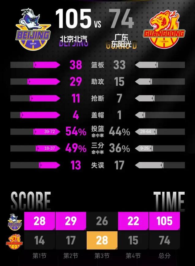 末节胡明轩连得5分,随后曾凡博左侧底角命中三分,广东队请求暂停。范子铭替补登场,胡明轩抢断上篮得分。双方派上全华班,由于分差较大,比赛最后3分钟提前进入垃圾时间。最终,北京队主场轻取广东队。