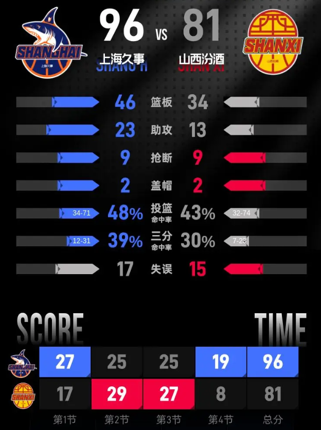 第四节,上海久事开始时表现依旧未能找到状态,分差一度缩小至3分。然而,随着比赛深入,上海久事逐渐适应场上局势,展开一波15分的进攻高潮,重掌比赛主动权。尽管山西汾酒在小节后段加大攻势试图缩小分差,但最终未能逆转。经过四节较量,上海久事以96-81赢下比赛。