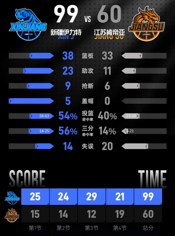 最后一节,新疆伊力特在开局阶段继续展现出良好的状态,迅速将领先优势扩大至42分。虽然在节中,江苏肯帝亚发动了反击,将分差缩小至32分,但新疆伊力特稳住了进攻节奏,并在比赛的后段再次扩大了领先优势。最终,比赛以新疆伊力特以99-60赢得胜利结束。