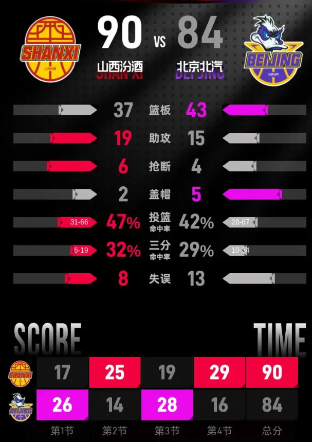 第四节,比赛进入最后一节,北京北汽开局表现不佳,未能迅速进入状态,而山西汾酒则趁机发力,快速抹平了比分并一度领先,北京北汽在小节后段努力追赶,逐步缩小分差。本节中,北京北汽的翟晓川表现出色,攻下13分,并命中1记三分。最终,山西汾酒以90-84赢得比赛。