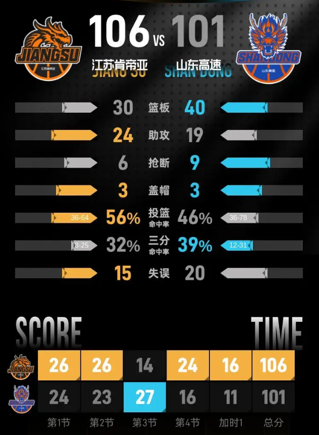 在第一个加时赛中,江苏肯帝亚开局状态回暖,迅速建立起9分的领先优势。尽管山东高速在小节后段紧追比分,但江苏肯帝亚凭借稳定的表现保持住了领先。最终,江苏肯帝亚以106-101赢得比赛,锁定胜局。