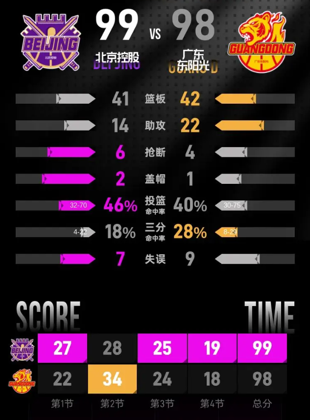 最后一节,比赛状况依然胶着,广东东阳光和北京控股互不相让,实力势均力敌。北京控股的廖三宁在这一节表现出色,单节独得12分,帮助球队在关键时刻紧咬比分。最后时刻,廖三宁抛投绝杀,北京控股最终以99-98险胜广东东阳光,赢得了这场激烈的对决。