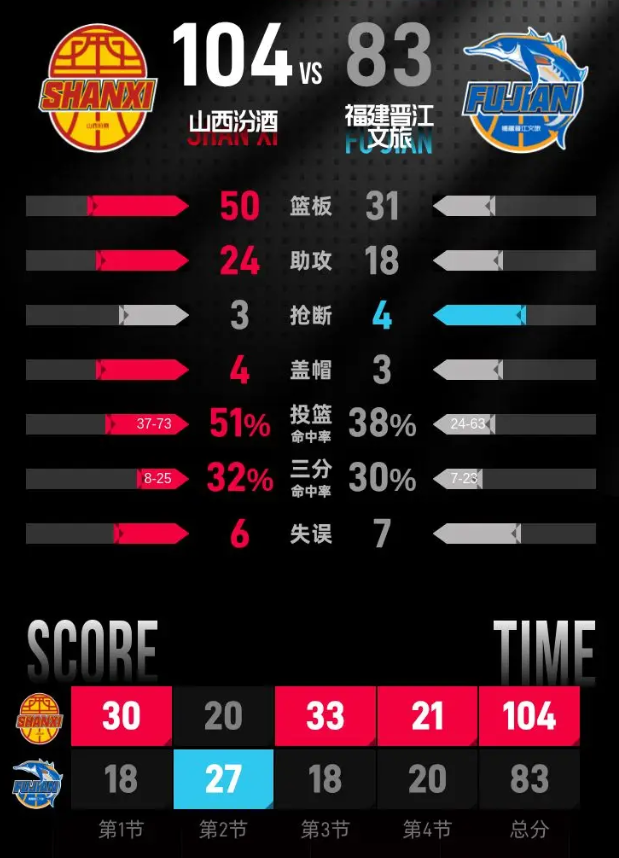 第四节,山西汾酒在比赛中处于绝对领先地位,牢牢掌控着比赛节奏,福建晋江文旅缺乏机会进行反击。最终,比赛结束,山西汾酒以104-83赢得了这场对决。