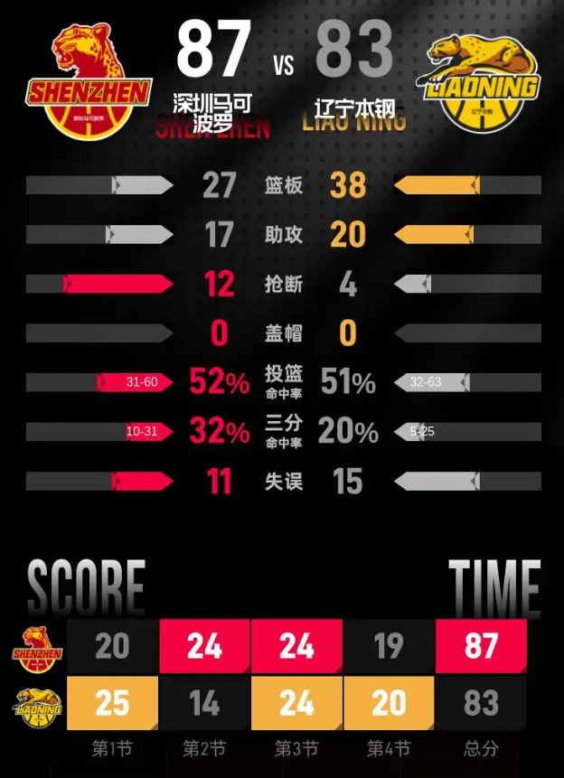 第四节,双方继续在场上展开相持,比分交替上升十分激烈。深圳马可波罗的贺希宁表现突出,贡献13分,其中包括1记三分球,帮助球队稳定局面。经过一番厮杀,深圳马可波罗最终以87-83赢下比赛。