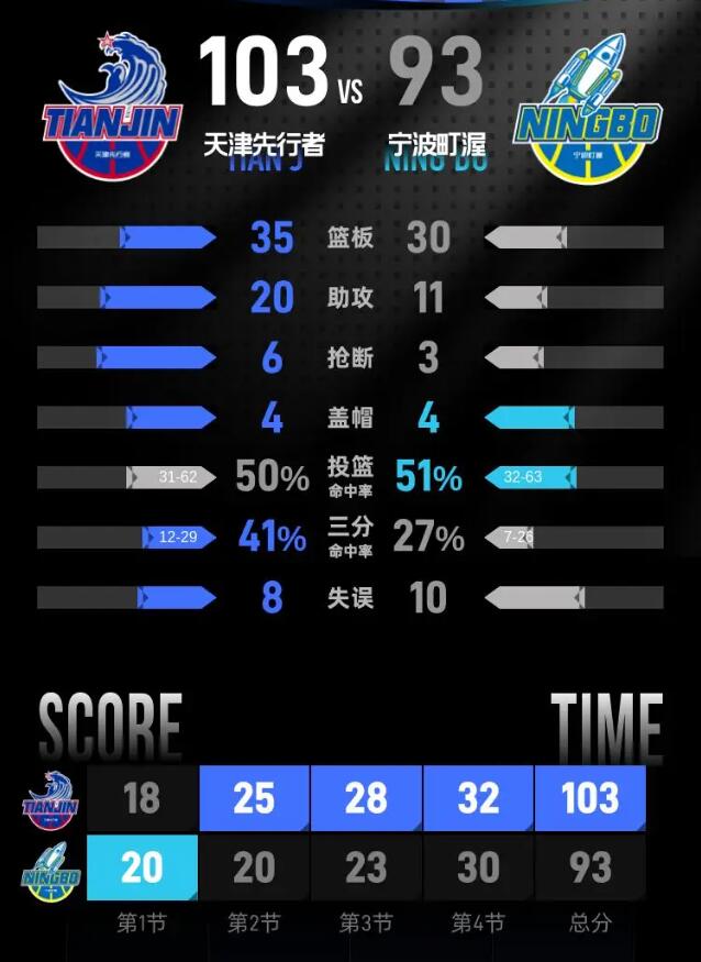 北京时间1月20日CBA常规赛第17轮,主场作战的天津先行者以103-93击败宁波町渥,天津先行者取得4连胜,宁波町渥遭遇3连败。大卫·詹姆斯23分10篮板2助攻,扎维尔·辛普森43分3篮板4助攻。
