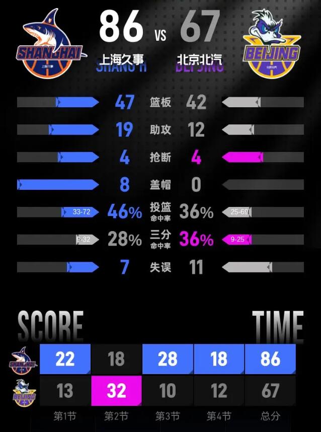 第四节,上海久事继续保持着领先优势,北京北汽无法找到逆转的机会。随着比赛的进行,上海久事牢牢控制比赛节奏,最终以86-67的比分赢得了本场比赛的胜利。