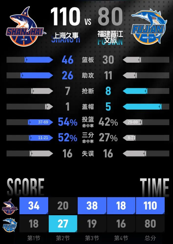 进入第四节,上海久事继续发力,一度将领先优势扩大至37分。在小节后段,福建晋江文旅再次努力缩小分差,展现出一定的韧性。最终,比赛结束,上海久事以110-80战胜福建晋江文旅,取得胜利。