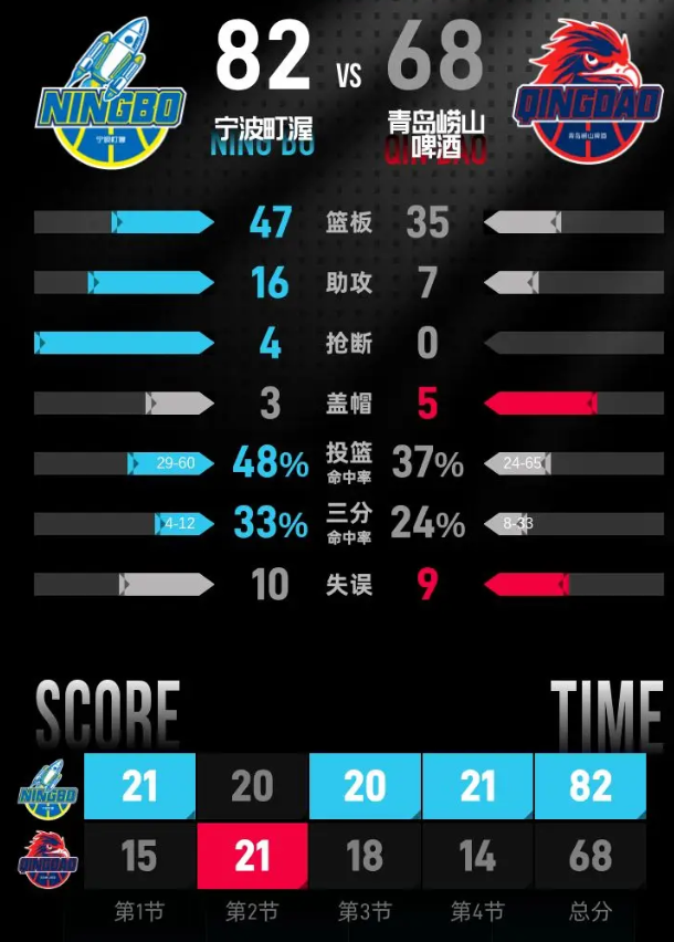 在最后一节,宁波町渥开局的手感不佳,分差一度缩小至3分,场面较为紧张。但随着比赛推进,宁波町渥状态回暖,打出一波17分的进攻高潮,重新建立起稳定的领先优势。尽管青岛崂山啤酒在小节后段加大进攻力度试图追分,却未能成功。最终,宁波町渥以82-68赢得了比赛。