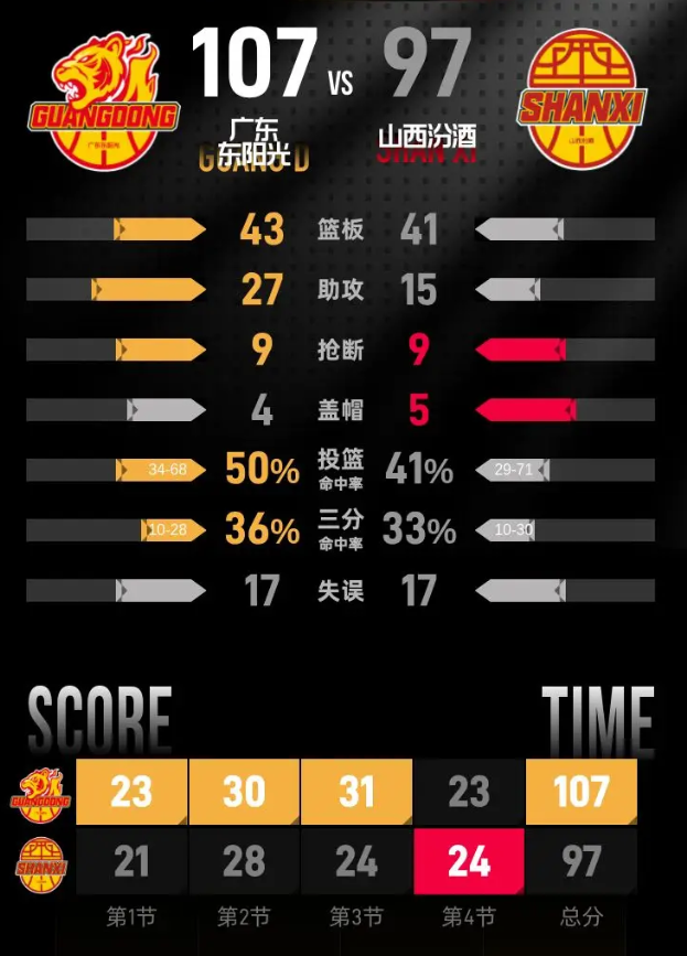 第四节,比赛进入最后阶段,广东东阳光牢牢占据场上优势,领先局势愈发明显,山西汾酒此时几乎没有机会进行反扑。本节比赛中,山西汾酒的哈米杜·迪亚洛表现出色,单节独得14分,其中包括1记三分。最终,经过激烈的四节battle,广东东阳光以107-97赢得了本场比赛的胜利。