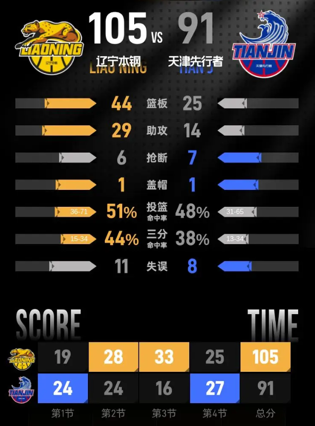 进入最后一节,辽宁本钢状态持续火热,开局再次打出一波进攻,将优势扩大至17分。面对困境,天津先行者努力展开反击,将差距缩小至5分。尽管如此,辽宁本钢保持住了进攻节奏,并在后段实现突破,再次拉开比分,最终以105-91赢得比赛的胜利。