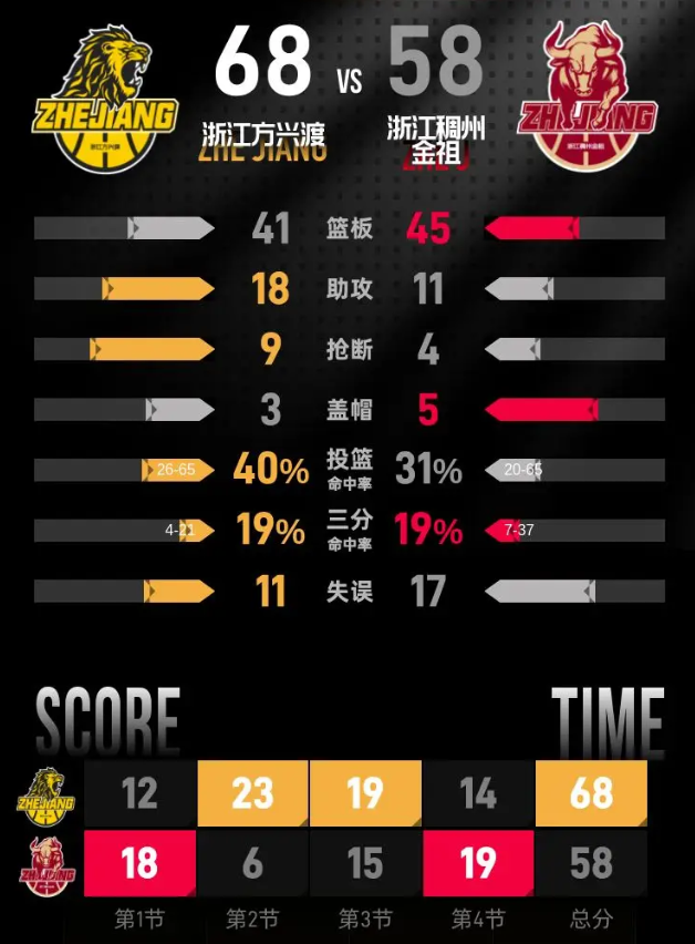 浙江方兴渡队:雷琼·塔克18分4篮板5助攻、胡金秋15分3篮板1助攻、贾卡尔·桑普森13分7篮板、巴里·布朗7分1篮板3助攻、孙铭徽6分4篮板5助攻、赵嘉仁6分1篮板2助攻、朱俊龙2分6篮板、约书亚·卡尔顿1分7篮板2助攻、吴骁5篮板。
