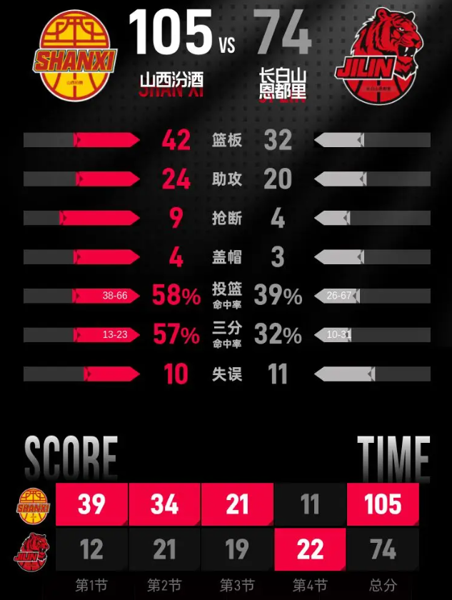 最后一节开局,长白山恩都里陷入了低迷状态,比分一度落后44分,形势相当严峻。尽管他们在节中奋起反击,将分差缩小到31分,但山西汾酒的得分状态依然火热,持续施压。随着比赛接近尾声,山西汾酒依旧保持显著的领先优势。最终,第四节结束时,山西汾酒以105-74赢得比赛。
