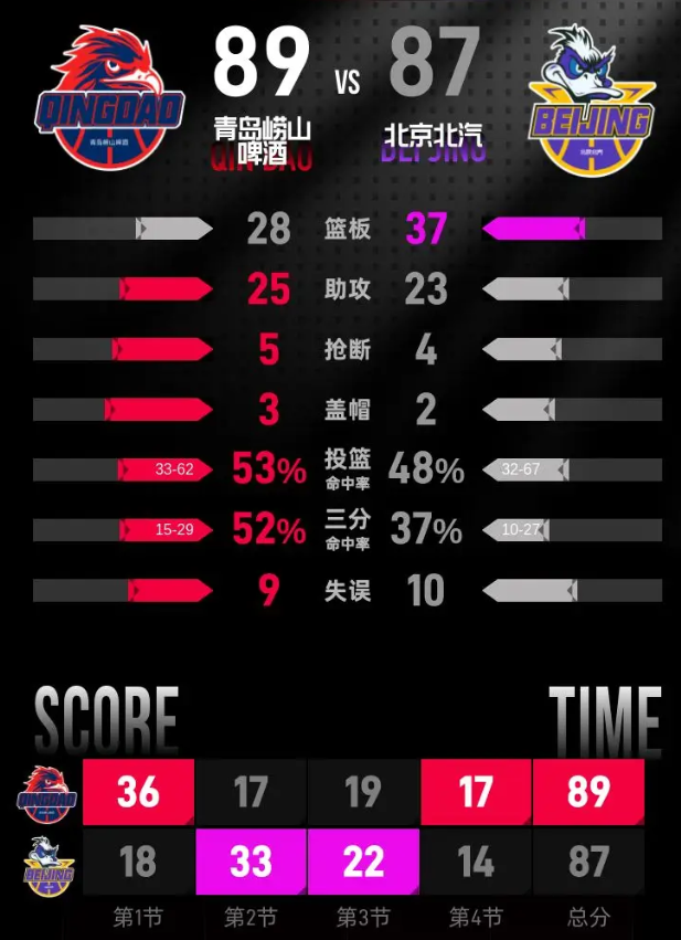 全场具体比分(北京北汽队在后):36-18、17-33、19-22、17-14。