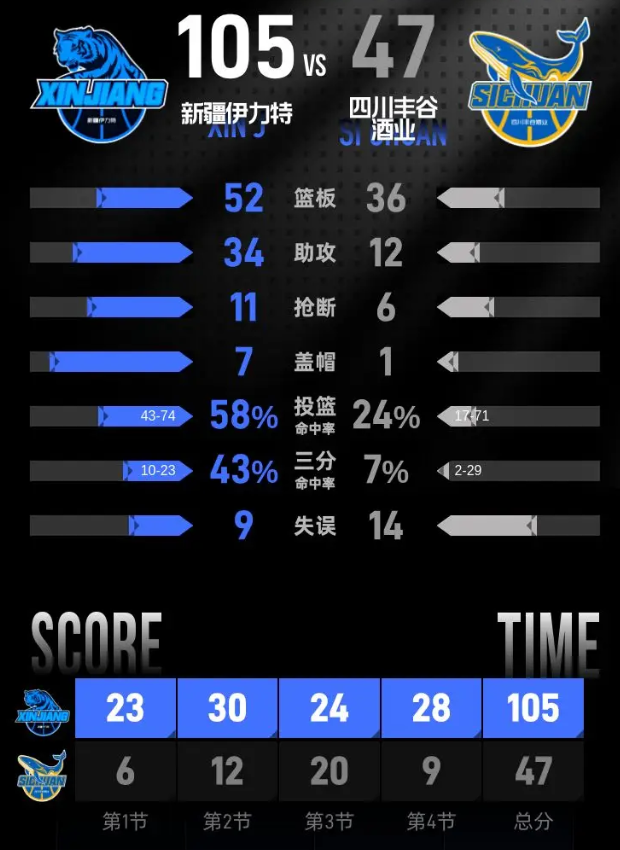 第四节,比赛进入最后阶段,新疆伊力特再次发动猛攻,将分差扩大至58分。尽管四川丰谷酒业在小节后段努力追分,但未能逆转局势。经过四节较量,新疆伊力特以105-47赢得比赛。