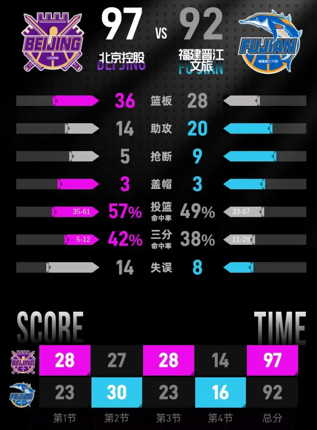 第四节开始,福建晋江文旅迅速发力,成功将分差缩小至81-83。但北京控股随即通过一波进攻再次将领先优势扩大到11分。随着比赛的进行,福建晋江文旅在小节后段再次追近比分,然而最终,北京控股以97-92胜出,锁定胜局。