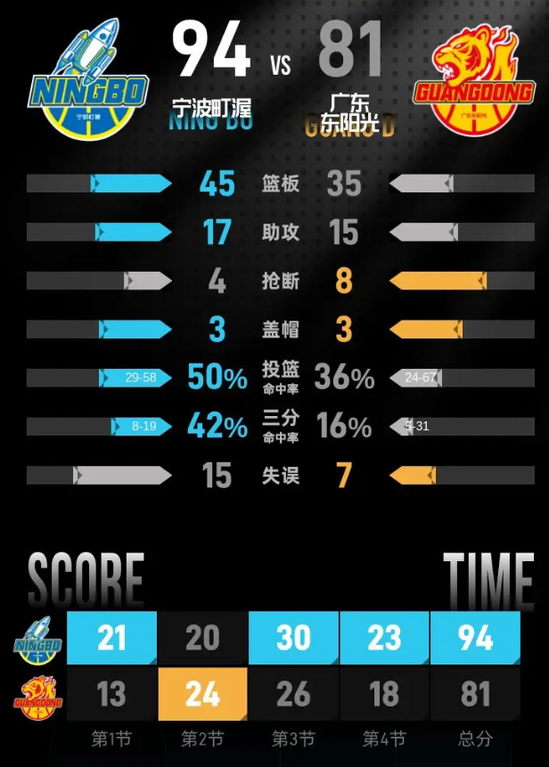 第四节,宁波町渥凭借开局强势的进攻将优势扩大至14分,广东东阳光并未放弃,努力将分差缩小至5分。不过,宁波町渥在后段的稳健表现再一次拉开分差,经过一场激战,最终以94-81赢下比赛,成功锁定胜局。