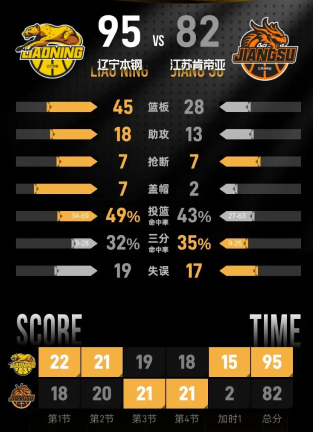 加时赛,辽宁本钢开局进入状态,一波进攻打出13分的优势,小节后段江苏肯帝亚紧追比分,进入本节末段,辽宁本钢优势仍在。第五节,辽宁本钢以95-82赢下比赛。