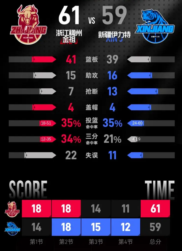 61-59!“打铁大战” 浙江客场2分险胜新疆
