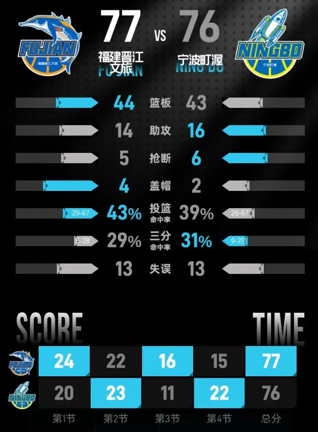 宁波町渥队:扎维尔·辛普森22分5篮板4助攻、富兰克林·杰克逊17分3篮板1助攻、赵建树11分1篮板、宁鸿宇11分3篮板、达柳斯·贝兹利7分6篮板4助攻、鲁吐布拉4分7篮板、李安3分、王凡懿1分1助攻、罗凯文3篮板1助攻、王俊杰5篮板1助攻、刘晓宇5篮板4助攻。