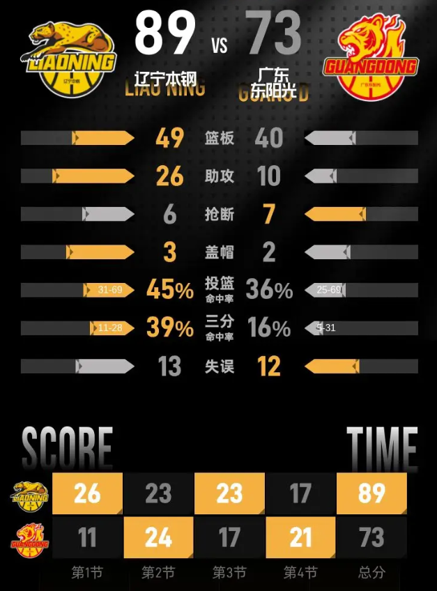 进入第四节比赛,萨姆纳继续砍分,广东外线逐渐找到手感,杜润旺和胡明轩先后命中三分,萨姆纳灌篮得手后分差缩小到13分。付豪内线得分加罚球稳住领先优势,莫兰德也两次篮下命中巩固优势,辽宁始终保持两位数分差。最后1分钟王岚嵚接到莫兰德助攻命中三分,将分差重新拉回16分,最终辽宁本钢以89-73击败广东东阳光。