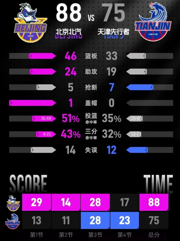 进入第四节比赛,方硕延续外线手感再中三分,陈盈骏接助攻三分命中后分差扩大到23分。天津先行者没有放弃,外线接连开火,郑昊燃、李宗霖先后投进三分,很快把分差缩小到14分。周琦内线打进还加罚为北京稳住局势,翟晓川篮下命中扩大优势,范子铭篮下打进后,天津先行者连续命中三分再次缩小分差。最后时刻方硕跳投命中拉开分差,詹姆斯最后阶段投进两分,北京北汽稳稳守住优势拿下比赛。