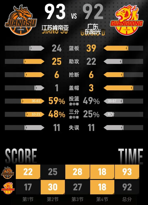 第四节开始后,双方比分始终紧咬,你来我往间比分多次打平。萨林杰连续得分帮助广东反超,随后广东打出一波小高潮,领先优势扩大到8分。江苏肯帝亚连续外线开火,贾尔斯命中三分,刘正清跟进再中三分把分差缩小到2分,庞峥麟抛投得手再次扳平比分。比赛最后26秒,崔永熙接徐杰助攻灌篮得分,广东以92-90重新取得领先。最后时刻,庞峥麟助攻吴羽佳三分命中完成绝杀,江苏肯帝亚93-92拿下胜利。