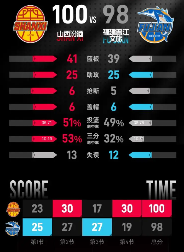山西汾酒队:哈米杜·迪亚洛23分12篮板6助攻、张宁16分6篮板2助攻、易卜拉希马·法耶12分8篮板3助攻、贾明儒12分2篮板3助攻、于米提·赛达克11分3篮板2助攻、葛昭宝10分1篮板1助攻、焦海龙6分2篮板1助攻、凯尔·盖伊5分1篮板2助攻、马尔科·奈特4分2篮板5助攻、韩霈瑜1分1篮板、刘传兴1篮板。