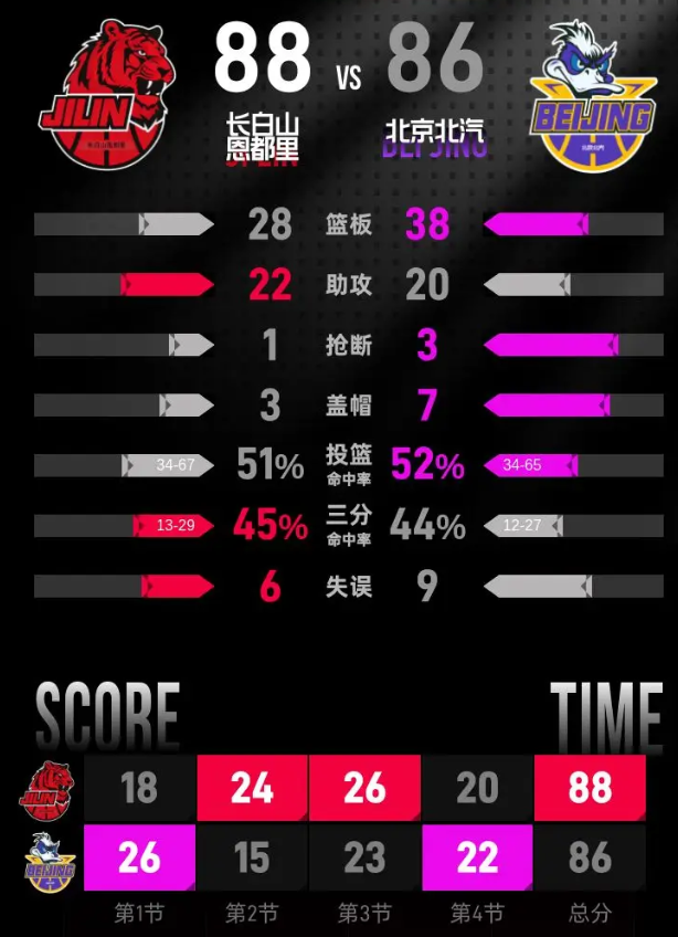 北京时间3月23日CBA常规赛第29轮,周琦在最后时刻关键2次罚球不中,最后的三分绝杀也偏出篮筐,客场作战的北京首钢遗憾的以86-88输给了吉林男篮。姜伟泽26分2篮板10助攻,陈盈骏20分5篮板9助攻。