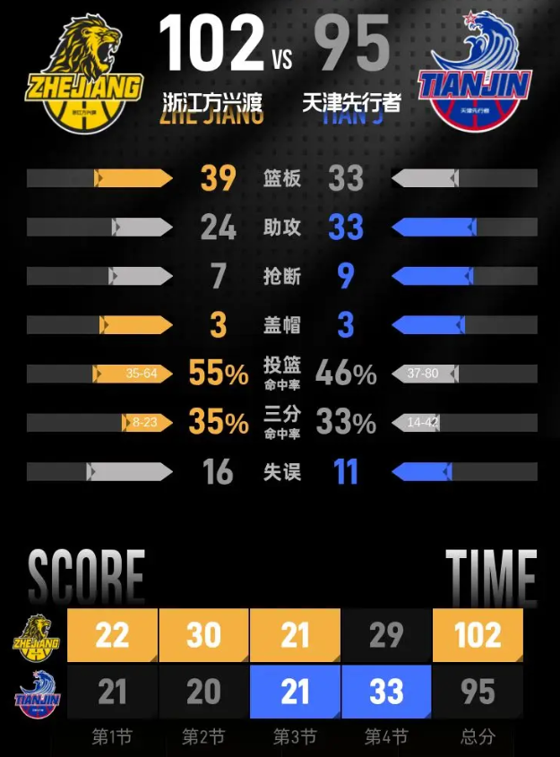 第四节开始后浙江率先发力,林秉圣接连命中两记三分,分差一度拉开到17分。天津进攻端找到手感,林庭谦接连命中三分,田雨也在外线开火,郑昊燃跟进得分,把分差缩小到个位数。最后一分钟内,天津连续追分,郑昊燃三分命中后林庭谦连拿5分,詹姆斯最后28秒命中三分把分差缩小到3分。浙江赵嘉仁两罚全中稳住局势,最后5秒塔克助攻胡金秋灌篮得分,最终浙江客场102-95击败天津。