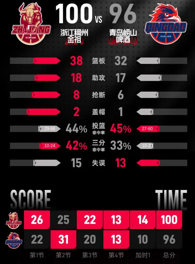 第一次加时中,加时赛开局浙江依靠约翰逊罚球和周怡杉三分拿到5分领先,韦瑟斯庞立刻回应三分,随后双方多次战平,比分交替上升。最后35秒张洪硕接到助攻灌篮得分,浙江重新取得2分领先。随后浙江抢到防守篮板获得罚球机会,程帅澎两罚全中,将分差扩大到4分,青岛最后一攻没能命中,浙江客场100-96击败青岛。