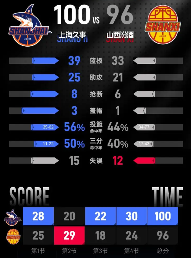 全场具体比分(山西汾酒队在后):28-25、20-29、22-18、30-24。