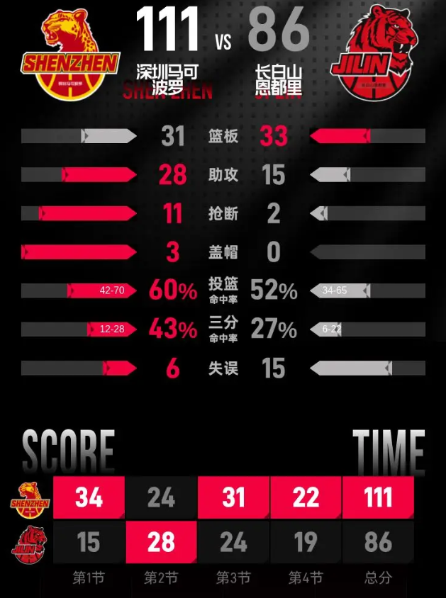 第四节开始后,姜伟泽率先跳投得分,史密斯连续两次上篮得手,王浩然接到助攻命中三分,分差来到27分。姜伟泽外线命中三分后连续四次跳投得分,将分差缩小到20分。深圳进攻端保持输出,李慕豪灌篮得分,卢鹏羽也完成灌篮,孙浩钦跳投命中维持领先优势。末节最后两分钟,段立谦两罚全中,孙浩钦四次罚球全部命中,最终深圳马可波罗客场以111-86击败长白山恩都里。