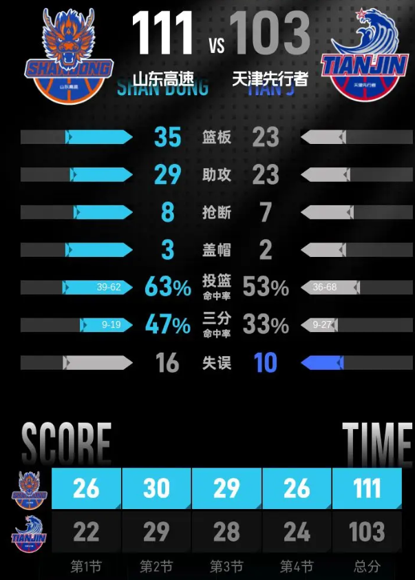 山东高速队:贝利·斯蒂尔27分5篮板1助攻、基昂泰·约翰逊26分4篮板7助攻、郭凯16分5篮板、陶汉林13分4篮板1助攻、德沃恩·艾库恩-珀塞尔7分4助攻、谢智杰7分2篮板7助攻、高诗岩5分3篮板8助攻、萨夏·琼斯4分4篮板、陈林坚3分2篮板、陈培东3分1篮板1助攻、王证2篮板。