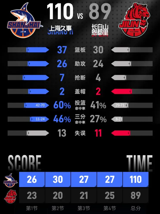 进入第四节比赛,栾利程开局连拿四分追分,王哲林很快内线连得四分回应,李添荣外线再中三分,弗格也投进三分,分差很快拉开到25分。长白山恩都里换上替补阵容后仍旧坚持追分,上海久事也换下主力,替补球员陆续得分,分差始终维持在20分上下。段立谦连续罚中四分缩小分差,节末闫鹏飞接崔晓龙助攻篮下灌篮得分,最终上海久事以110-89击败长白山恩都里。