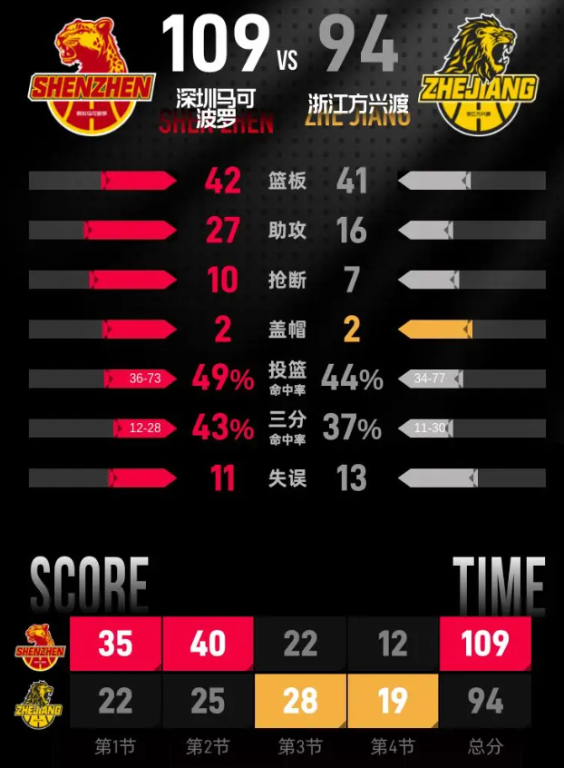 比赛进入末节,深圳换下核心主力,浙江抓住机会继续追分,朱俊龙、卡尔顿先后得分,王浩然接史密斯助攻完成灌篮,深圳依然保持20分以上领先。最后三分钟浙江连追6分,王欣瑞命中三分,苏若禹跳投命中,最终深圳以109-94击败浙江。