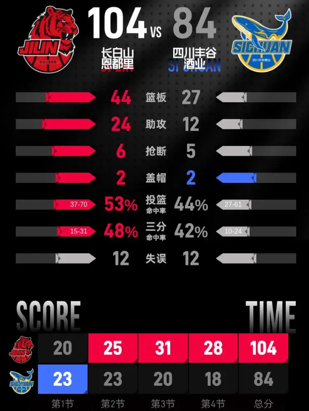 比赛进入末节,主队延续第三节的火热手感,贾昊开场就命中三分,姜伟泽两罚全中,威尔逊篮下得分,分差不断扩大。贾昊和威尔逊先后命中三分,分差拉开到20分以上,尽管四川队左朕年、刘冠杉先后命中三分,维纳莱斯也通过罚球得分,将分差缩小到16分,始终没能进一步缩小差距。最后阶段曾繁日连续篮下得分,又两罚全中锁定比分,最终长白山恩都里以104-84击败四川丰谷酒业。