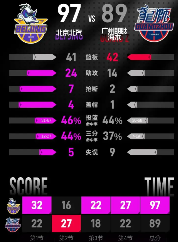 比赛进入末节,周琦在内线连续接助攻得分,陈盈骏命中三分把分差拉开到8分。伯顿和威金顿连续砍分,广州一度将分差缩小到1分。杰曼站出来连续命中两记三分,帮助北京稳住领先优势。斯佩尔曼两罚全中后,霍勒迪通过违体犯规罚球两罚全中追分,张鹏珲接到翟晓川助攻命中三分,分差再次拉到7分。威金顿罚中一分后,杰曼在最后时刻稳稳两罚全中,最终北京北汽以97-89击败广州朗肽海本。