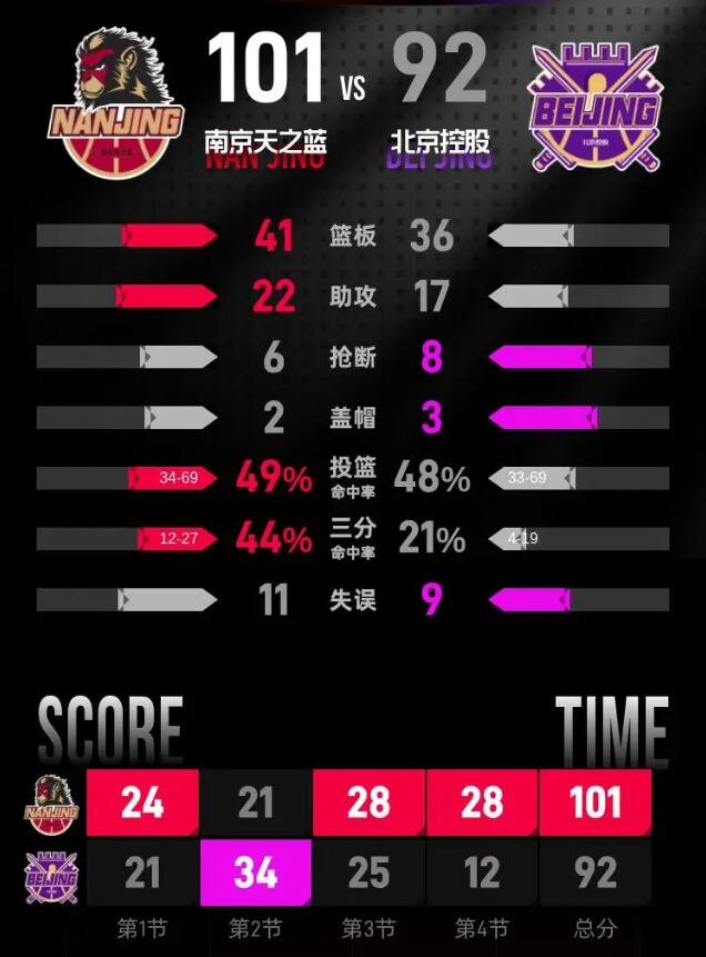 进入第四节比赛,南京队发起全面反击。赵柏清篮下得分,马内克跟进上篮得手,郭昊文连拿5分帮助主队完成反超。郭昊文两罚全中扩大优势,马内克再添两分,祝铭震接邬挺嘉助攻命中三分,分差拉开到两位数。佩里命中三分缩小分差,孟子凯上篮得分进一步压缩差距,郭昊文立刻回敬三分稳住局势。帕克上篮得手后,里勒、廖三宁相继得分追分,祝铭震接赵柏清助攻再中三分,进一步拉开差距。最后时刻阿卜杜赛麦提罚中一球,最终比分定格在101-92。