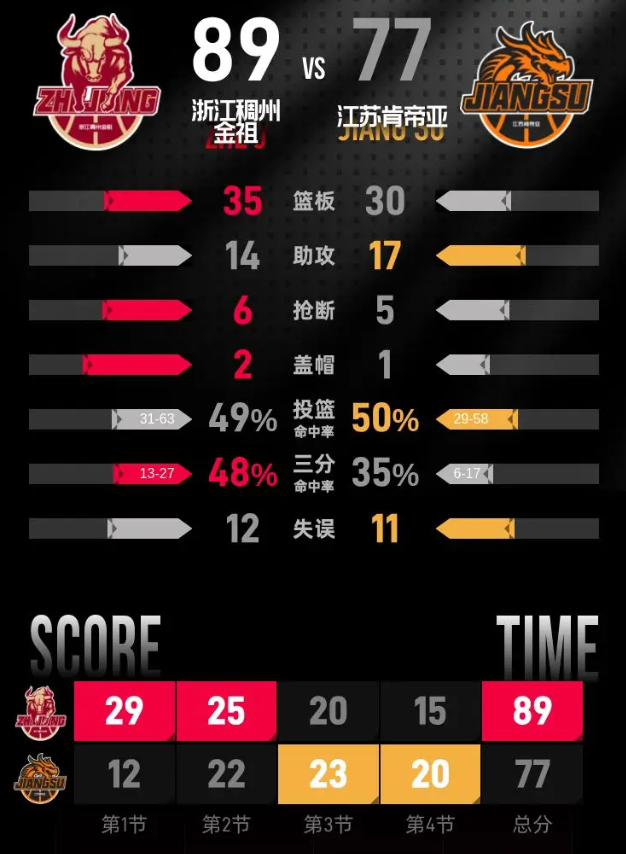进入第四节比赛,江苏延续追分势头,亨特、庞峥麟连续得分,分差很快缩小到10分。程帅澎接连命中两记三分,帮助浙江重新把分差拉回15分。最后两分钟,吴羽佳命中三分,蒋浩然完成上篮,江苏将分差缩小到12分,浙江稳稳守住领先优势,最终客场带走胜利。