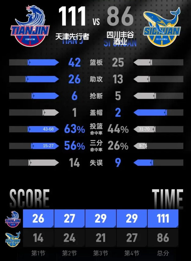 进入第四节比赛,天津稳扎稳打不断扩大优势,内线核心詹姆斯连续得分,后卫谷泽浴多次突破上篮得手,分差很快拉开到25分以上。天津换下全部主力进入练兵时间,替补球员延续进攻状态,始终保持大比分领先。四川阵中维纳莱斯和赵芮接连命中三分追赶比分,终场前田雨命中三分锁定比分,最终全场比分定格在111-86。