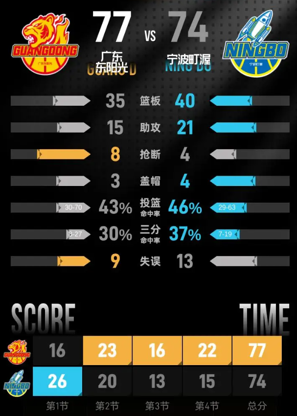 宁波町渥队:扎维尔·辛普森21分5篮板7助攻、富兰克林·杰克逊20分3篮板1助攻、塔克·法尔14分6篮板、罗凯文7分4篮板1助攻、赵建树5分2篮板3助攻、鲁吐布拉5分8篮板、王俊杰2分1篮板4助攻、宁鸿宇3篮板2助攻、俞长栋3篮板2助攻、戴昊2篮板1助攻。