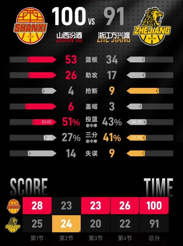 进入第四节比赛,布朗开场命中三分,赵岩昊连得4分,浙江再次反超比分。焦海龙和葛昭宝连续内线得分,山西拿回领先,布朗手感滚烫数次追平比分。葛昭宝命中三分后布朗立刻回敬三分,分差始终保持在5分以内。最后五分钟布朗连得三分再次追平,贾明儒站出来连续取分,帮助山西拉开到5分优势。林秉圣三分命中追到只差2分,贾明儒抛投稳住局势,张宁三分命中把分差拉大到7分。最后一分钟贾明儒两罚全中,朱俊龙上篮得分,奈特最后两次罚球命中,山西主场100-91收下胜利。
