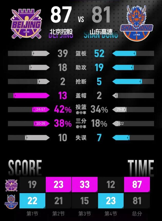 北京时间4月15日CBA常规赛第39轮,主场作战的北京控股以87-81击败山东高速,山东高速遭遇4连败。邹雨宸13分10篮板1助攻,陶汉林13分13篮板0助攻。